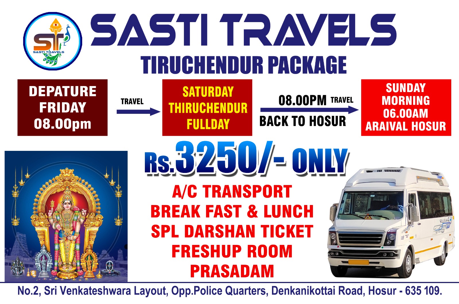 Morning 6.00 AM Reach at Tiruchendur Check in to hotel fresh up After Fresh up Mottai Adithal (Head Shaving) after head Shaving Holy bath to Nazhik kinaru after Holy Bath darshan to Tiruchendur Murugan temple after darshan Next Visit to Beach and Back up Hosur